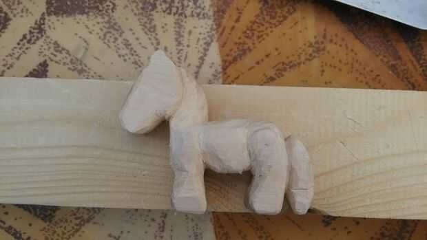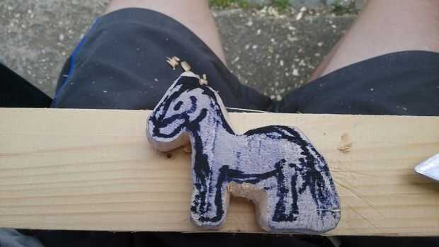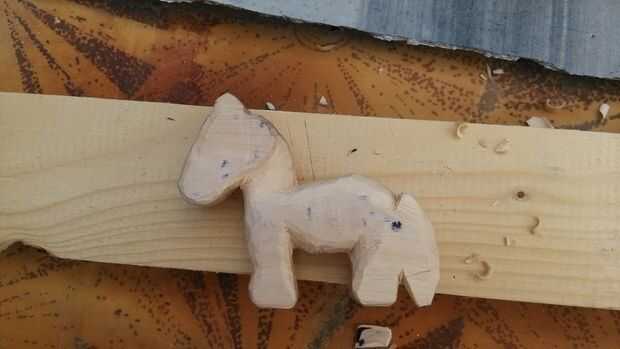 Cortar la madera en una tabla y dibuja un caballo simple (no agradable en mi caso). Cortar alrededor con cualquier Sierra como se muestra. Luego viene el cuchillo. Empecé colocando un tablón de madera sobre mis rodillas para actuar como una tabla de cortar. Primero recortas la forma básica de su caballo. Lo hice por corte (como carne) que significa empuje la cuchilla hacia abajo hasta que se detenga en el tablero.