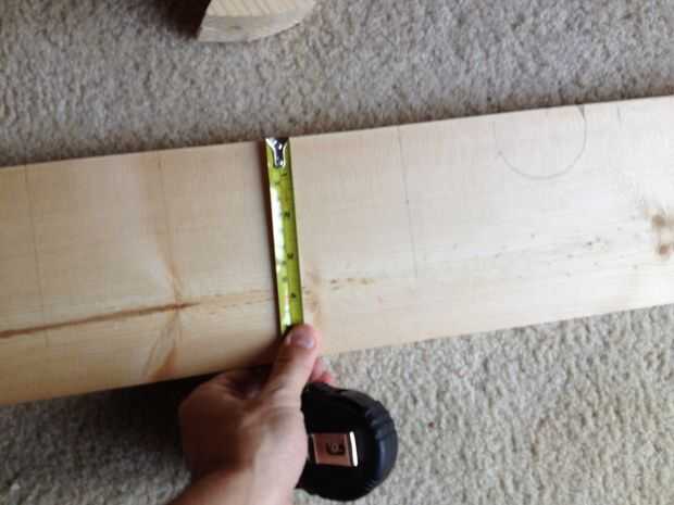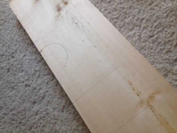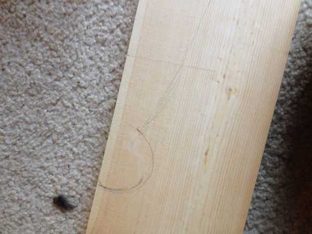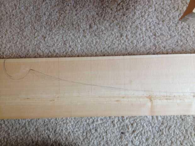 Como con las partes del cuerpo, primero creé una plantilla de papel y dibujó a la madera a cortar. Una vez dibujé el diseño sobre la madera, he encontrado y había marcado el centro del eje de balancín. Entonces dibujé una línea cada dos pulgadas en ambas direcciones de la línea central. Utilicé estas líneas marcador para asegurar que la curva para el eje de balancín fue incluso. Por lo tanto, a dos pulgadas del centro en ambas direcciones, subió sólo 1/8 de pulgada desde la parte inferior de la madera, uniformemente en ambos lados del centro. 8 pulgadas de centro en ambas direcciones, la línea curva intersección en sólo 2 pulgadas de la parte superior de la Junta. Aseguró que eran igualmente distantes de la línea inferior en ambas direcciones. Si no lo fueran, corregir lo mejor que pude.