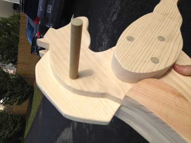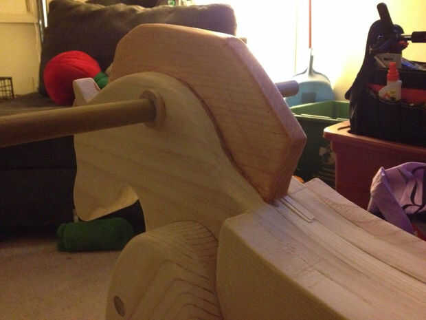 Mientras tuve el taladro hacia fuera, con cuidado perforó un agujero a través de la cabeza del caballo para el asimiento de la mano. Entonces deslizó un pedazo de pino de 1/2 pulgada, sobresale 5 pulgadas de cada lado.