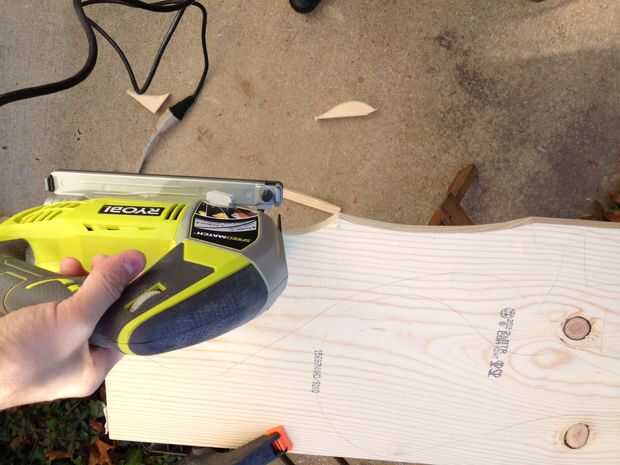 Usando las plantillas que esbozar el número apropiado de piezas en pino de 1 x 12. Como se puede ver en el diseño, he tenido que cortar 4 patas delanteras (como combiné dos piezas juntas para hacer una sola pieza), 4 hacia atrás las piernas, los contornos del cuerpo 3 (sólo uno con pelo y cola conectado) y dos piezas de la silla de montar. Tomé las tablas con las piezas contorneadas y había sujetada a una pequeña mesa fuera. Utilicé una sierra de calar y había seguido las líneas de contorno.