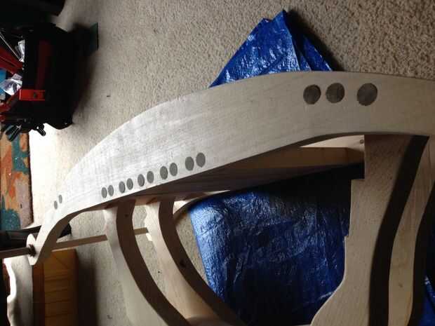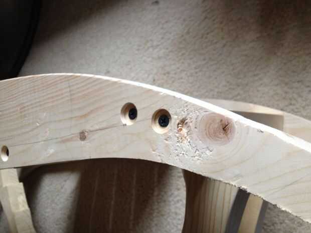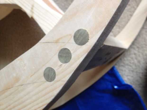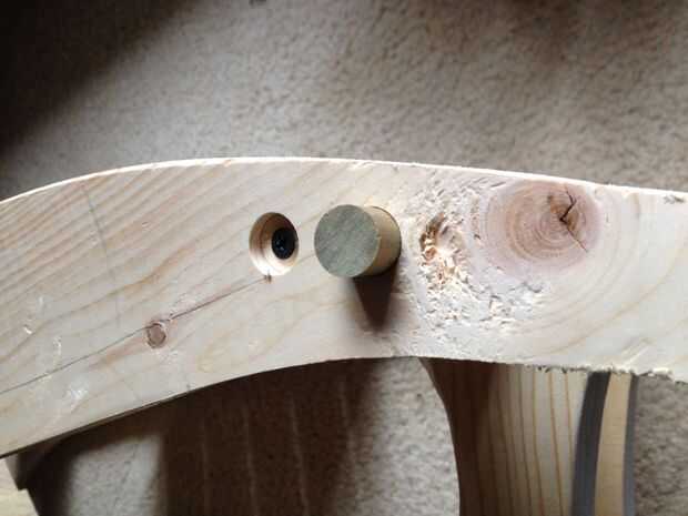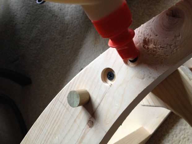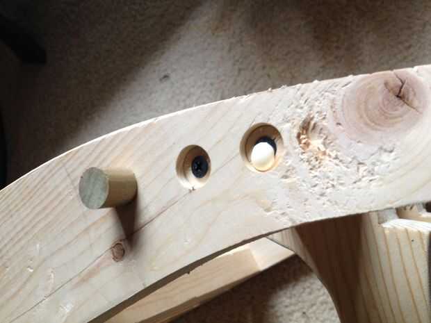 Como con los otros agujeros en el eje de balancín, le enchufamos los orificios de la cubeta con 1/2 espiga y cola. Una vez que todos los agujeros estaban enchufados, lija la cara de la mecedora tablero para hacer es lisa.