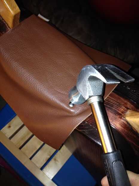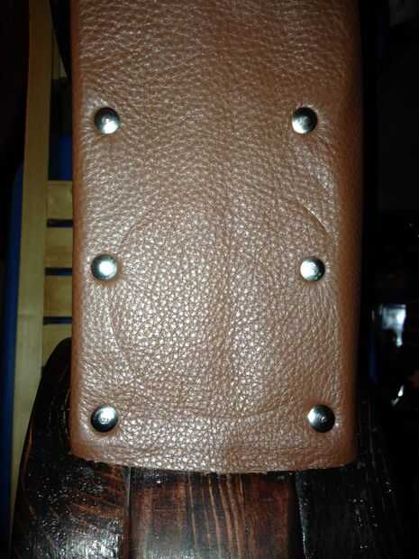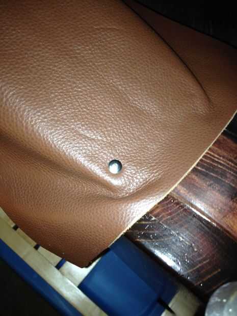 Mientras se secaba el pegamento de madera empujé en 6 chinchetas plata para sostener el cuero en su lugar y efecto visual.