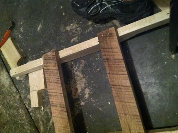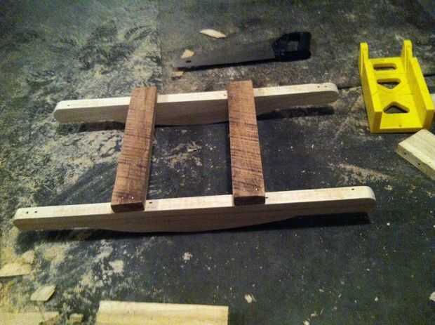 Para terminar la base de su tiempo para unir todo. Puse un segmento centrado en la marca de 10", y el otro centrado en la marca de 20". Até con una combinación de pegamento para madera y el 2-1/2" clavos. Esta configuración proporciona máxima resistencia y llena los huecos de la madera que no es 100% plana.