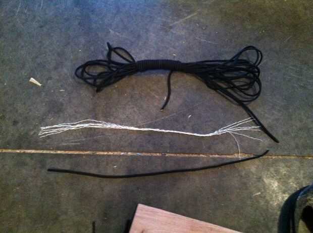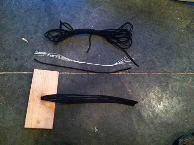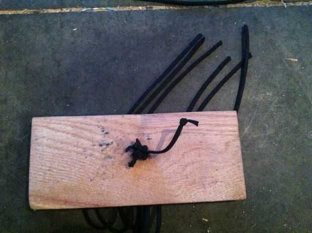 En la pieza de la silla de montar con un agujero rosca 5-6 piezas de paracord eviscerado a través del orificio. Cada filamento de paracord era lo suficientemente corto para no arrastrarse en el piso. Un nudo en cada cuerda para tirar a través. El lado con los nudos es ahora la parte inferior. Fije las piezas de la silla de atrás al frente con clavos y pegamento. utiliza tus uñas más cortos esto. Mis uñas 1" eran demasiados por lo que inclinó sobre lo pegado por debajo. Si usted decide cortar ellos Asegúrese de que está cortadas al ras para que nadie se corte en ellas.