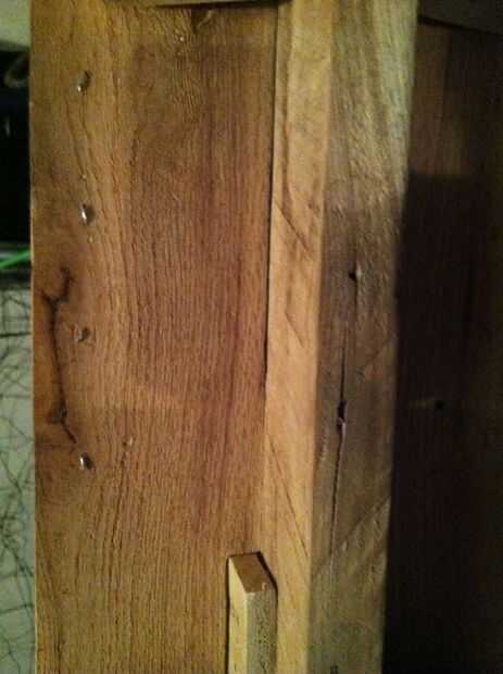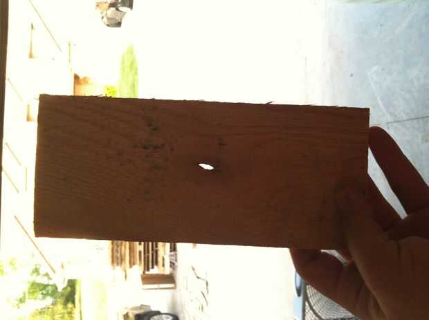 Entonces, vamos a hacer la silla de montar. Corté 3 deckboards 8" de largo. El último tablero de cubierta que elegí tener un nudo en el medio. He utilizado un martillo y un clavo para noquear el nudo (si no existe ningún nudo, podría utilizar un taladro y perforar un agujero). Lije todas las piezas de la silla de montar.