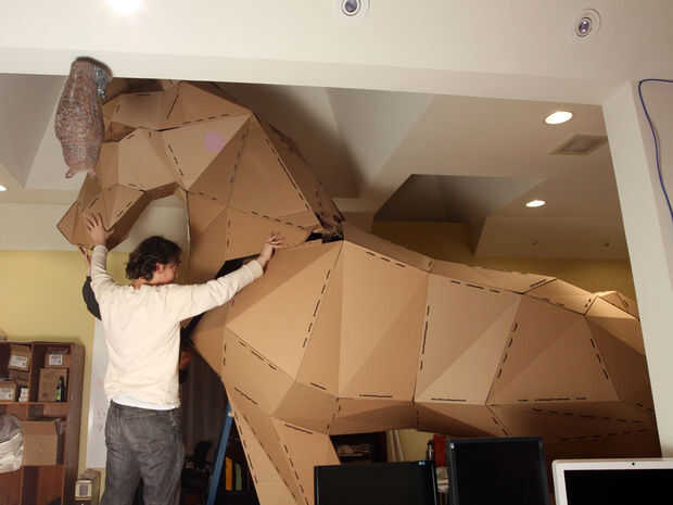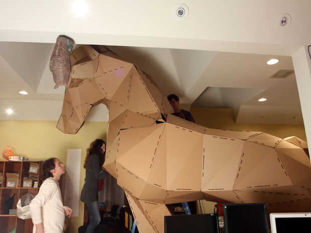 Conexión de la cabeza fue un esfuerzo de tres personas. El caballo terminado era de 12 pies de altura. El techo del laboratorio de Instructables es de sólo 10 pies de alto. Por suerte, había anticipado esto y coloca el caballo debajo de un gran lucernario empotrado.
