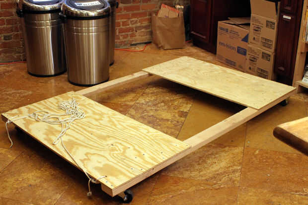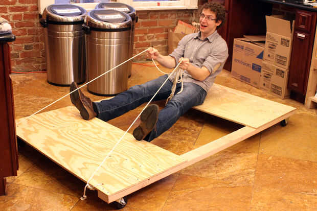 hice un carro de cuatro ruedas de 2x4s y madera contrachapada. Las hojas de madera contrachapada reforzadas desde abajo y coloca de modo que cada uno apoye un par de patas del caballo. Había roscada una cuerda de nylon resistente a través de dos orificios en la parte delantera del carro, para que el caballo entero podría ser fácilmente remolcado.