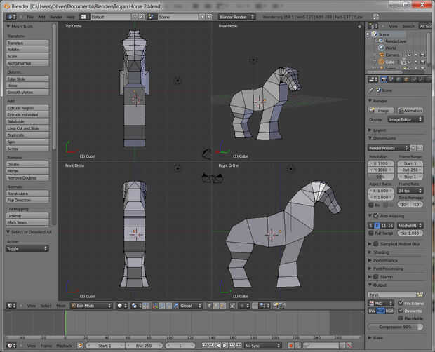 En lugar de utilizar algún otro modelo de un caballo de Troya, decidí diseñar mi propia desde cero. Yo sabía que quería el modelo final a ser absolutamente simple y angular, ya que esto sería más fácil deconstruir en un número razonable de paneles de cartón. Afortunadamente, es mucho más fácil modelar un caballo de baja resolución estilizado que realista y detallada.