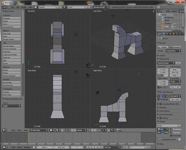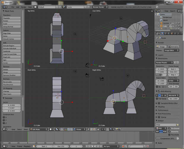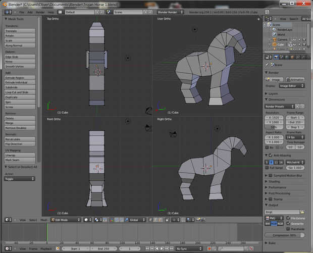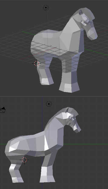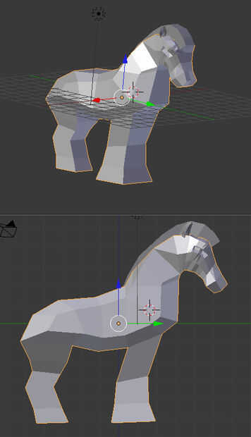 Modelo de caballo en Blender, a partir de un simple cubo y sacar nuevas caras de él hasta que tuve un bosquejo muy áspero de un caballo, como se muestra en la primera imagen aquí. Luego poco a poco había refinado la forma del caballo, subdividiendo los bordes donde sea necesario, hasta que tuviera algo más distintivo. Modelar las orejas, la cola y la crin por separado, luego se unió a ellos al caballo con una operación booleana.