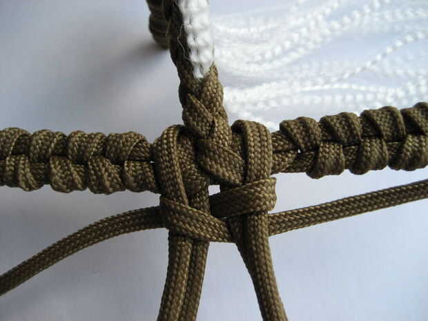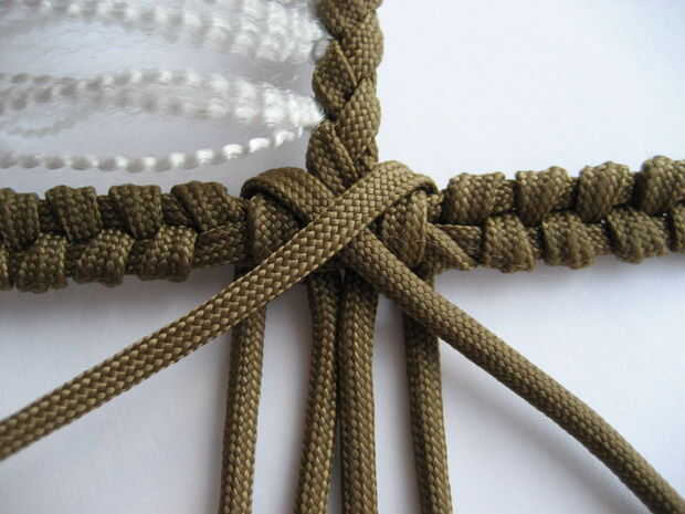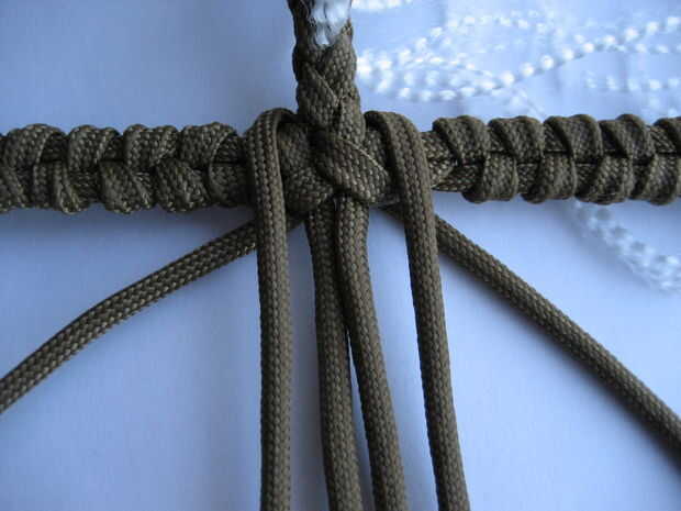 Doblar las dos puntas hacia atrás por encima de los hombros del caballo.  Hacer las perneras 3 1/2" de largo.  Doblar los cables debajo del caballo y Cruz en el centro.  Comenzar el tejido de la espalda doblando las puntas alrededor y sobre cada pata como se muestra en la imagen. continúe este patrón tejer hay cinco lazos a cada lado del caballo.  Esto hace que la espalda del caballo.  Mantener el tejido apretado.