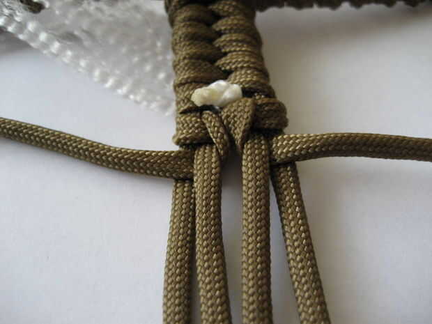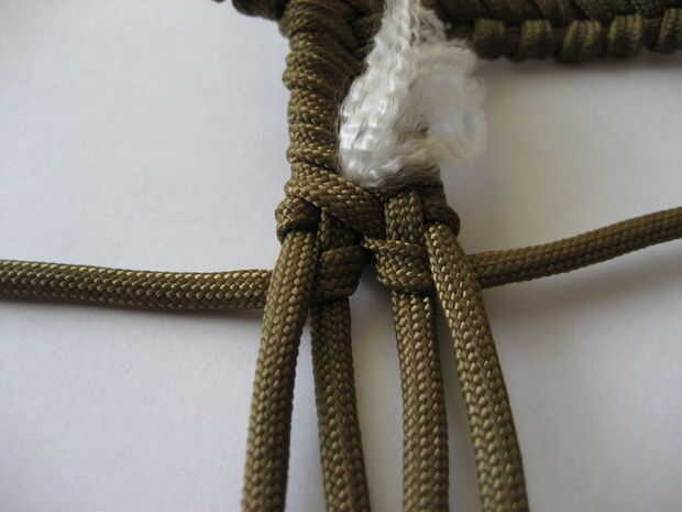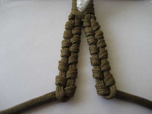 Empezar el tejido por llevar los cables por detrás y entre las piernas, en la parte superior y hacia abajo en el centro de las piernas como se muestra.  Continuar el tejido para cada pierna hasta que hay seis bucles en la parte exterior de cada pierna.  Los conductores deben terminar hacia el exterior de la pierna como se muestra en el cuadro terminado.