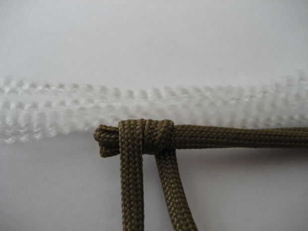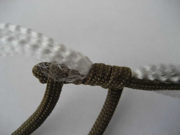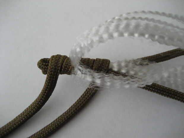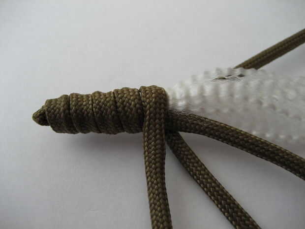 Aplanar el doblez del centro de la 36" paracord.  Se superponen lo 60" paracord en aproximadamente 1/8" desde el extremo. Hacer un abrigo con el cable más corto de los 60" cable.  Coloque el centro del cabello melena al final de esta envoltura.  Hacer dos vueltas más con el cable más corto para fijar en el pelo de la melena.  Doblar el pelo de melena detrás en sí mismo y entre que el centro envuelto alrededor de los cables.  Hacer 5 vueltas con el cable de más de 60" cable encima de la primera envoltura y el pelo de melena.