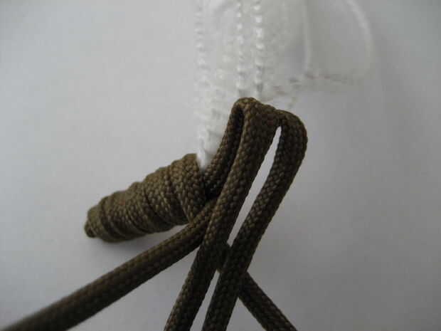 Entre el cable de más de 60" cable bajo plomo más corto entonces forma las orejas con los dos cables desde el centro de la cabeza.  Asegúrese de que el pelo de melena puede salir entre las orejas.  Llevar los cables desde los 60" cable alrededor de la cerradura en las orejas.  Observar que el cable izquierdo cruza sobre la delantera derecha.