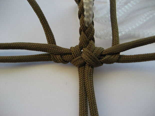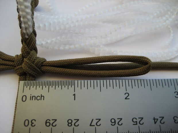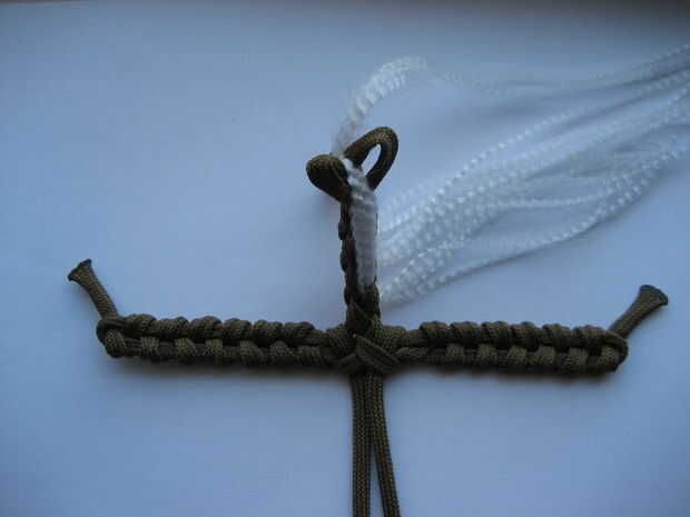 Ajustar el tamaño de cada lazo de la pierna que 2 1/2" desde el centro del cuello como se muestra.  Comenzar el tejido de la pierna llevando los cables de la pierna desde atrás luego hacia arriba y sobre la parte inferior del lazo de la pierna como se muestra.  Continuar tejiendo las piernas hasta que queden 6 lazos encima de las piernas como se muestra en el cuadro terminado.  Los conductores deben salir hacia fuera la parte superior y la parte posterior de la pierna.