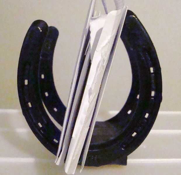 Otro gran uso de herraduras es un sostenedor de la carta.  Es ideal para la oficina de un hombre.  Fáciles de hacer y no requiere muchas herramientas o cosas para comprar.  Es probable que tenga todo, excepto quizá los zapatos del caballo.  Si tienes un amigo o un vecino que posee caballos, lo más probable es que tienen unos extra estarían encantados de darle.  Puede comprar por un dólar de una tienda veterinaria como fuente del Tractor.