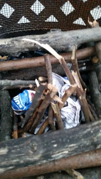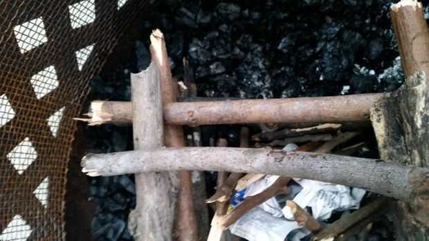 Inicio próximo del partido leña gruesa y lugar inclinándose sobre la yesca. Pone todo el camino alrededor de la oferta en un tipi como moda. Seguir aumentando en tamaño del palillo hasta que todas las astillas y la mayoría de la madera de tamaño mediana se utiliza. Se muestra arriba.