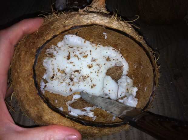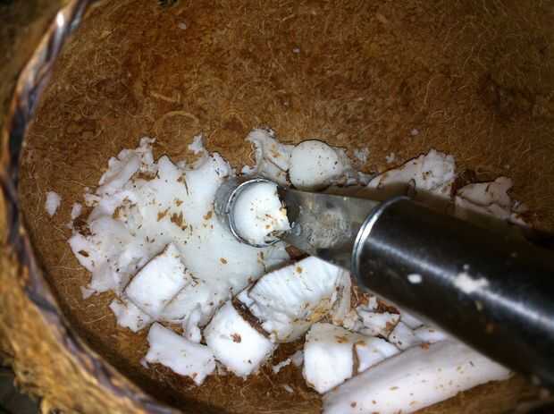 La carne de coco de la cáscara usando su cuchillo, cuña separado. Lea acerca de las opciones para facilitar este proceso, pero no probar-sugiere colocar el coco en el congelador o en el horno. Simplemente utiliza un cuchillo y apple corer y sacó la carne de coco en unos veinte minutos.