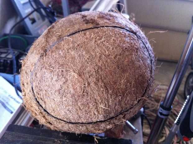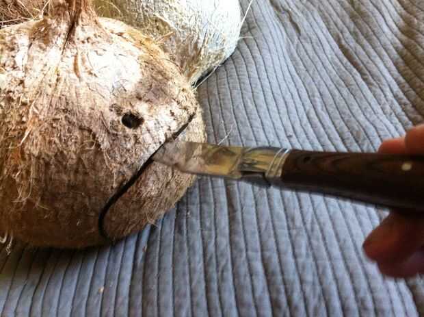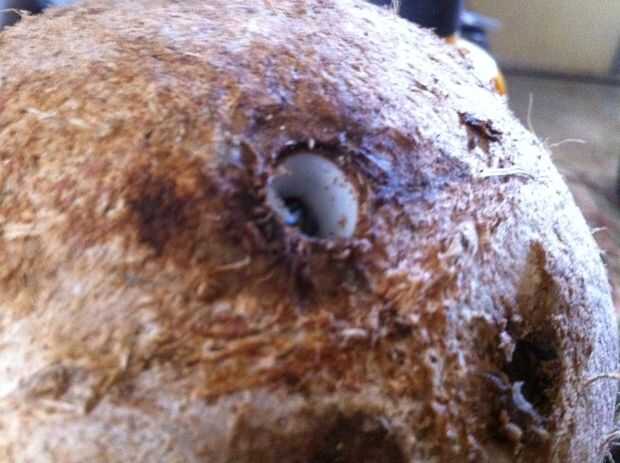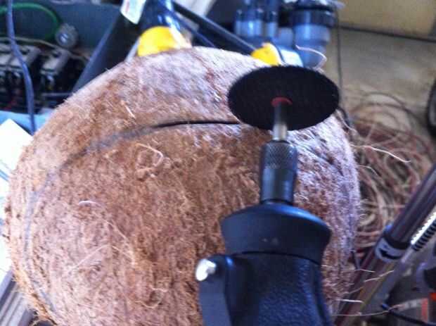 Con el coco con abrazadera para evitar que resbale, empezar a cortar el orificio de entrada. Trabajar su camino alrededor de la abertura, reajustar si es necesario para hacer un juego limpio de cortes.