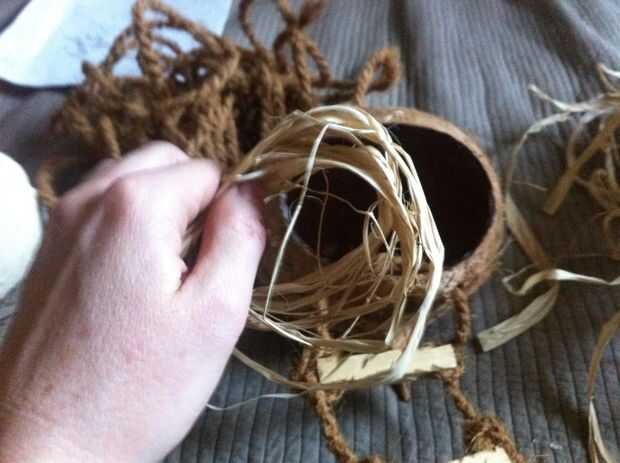 Para terminar su choza de coco, rodar un par de hebras de rafia [o nada animal friendly] y coloque en el piso de la choza.