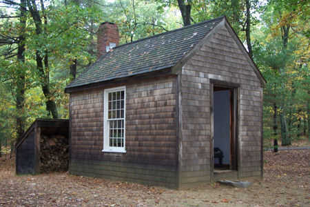 Cuadro cabina de 10 x 15 de 1-Thoreau (réplica) en Walden Pond vistas (cortesía de Wiki)