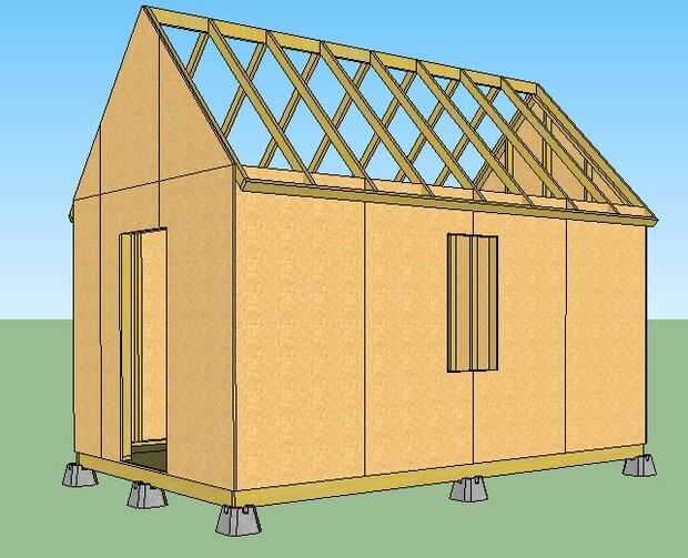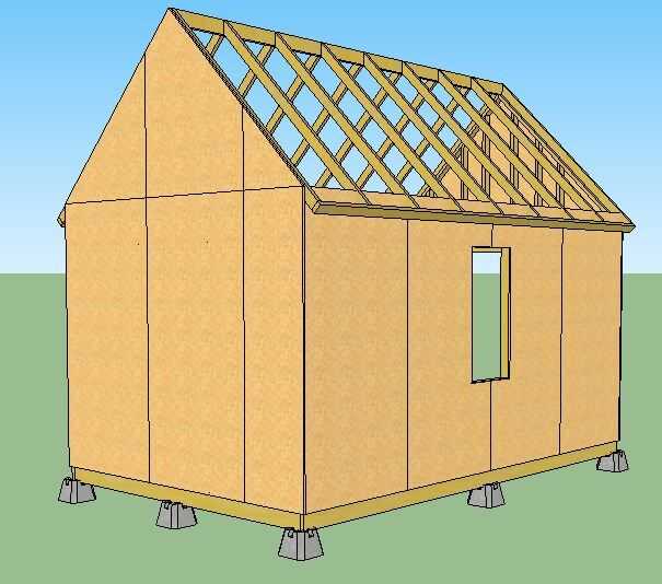 Cuadro 1 muestra revestimiento OSB aplicado a la pared lateral y frontal con puerta y ventana de los recortes.