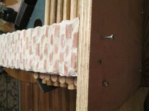 Perforé dos agujeros a través de la plataforma y hasta en el 1 x 3 y lo insertamos dos largos tornillos en la chimenea. Yo también lo había anclado a media altura en una de las varillas roscadas. Mi amigo dijo le recordaba a las viejas chimeneas en CA, para la impermeabilización del terremoto. ¡ Yay para la autenticidad!