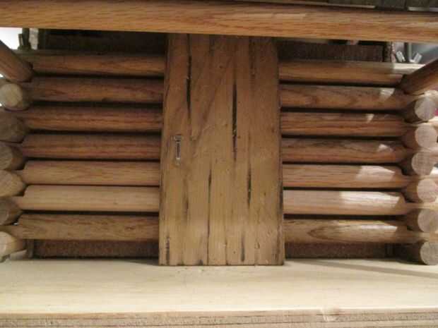 Encontré un trozo de madera de aspecto antiguo que era perfecto para la puerta. Pinta unas líneas de estriación, agregué un cerrojo de ropa para la manija y pegado a la casa.
