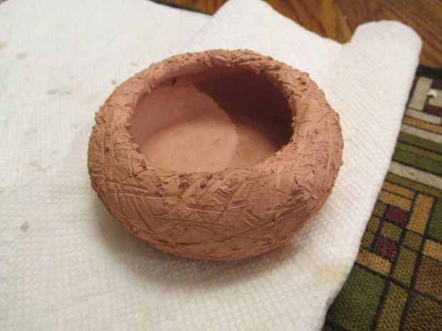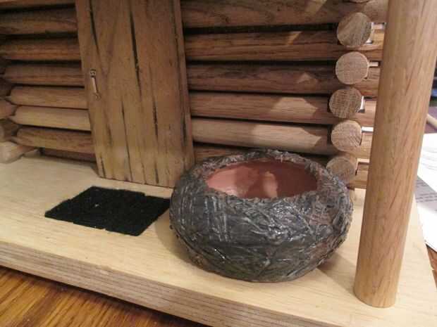 Hice un bowl nido fuera de la misma arcilla como los ladrillos de la chimenea, para los birdies tener agua fresca. Pongo un lavado de pintura carbón en él.