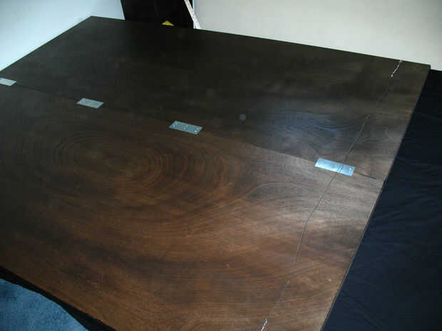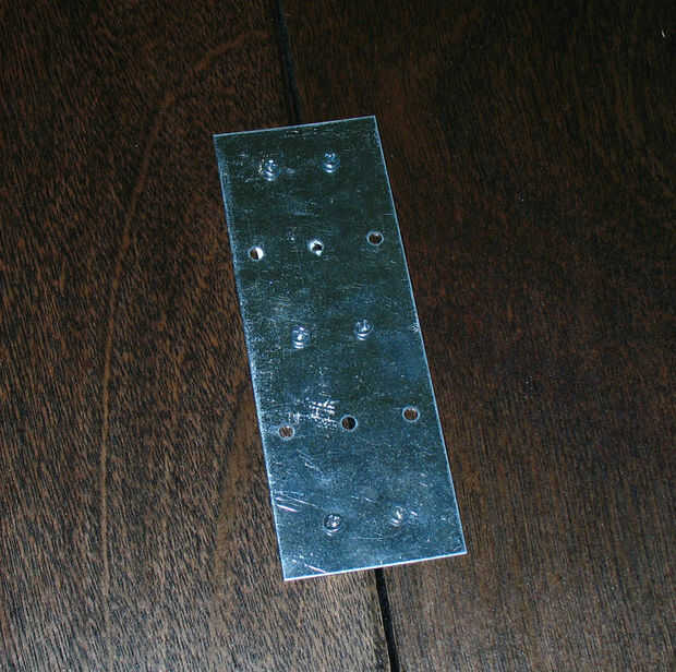 Coloque cuatro tie (que se encuentra en el Departamento de madera/plataforma de mi tienda de hardware) con pequeños tornillos de madera que forma las placas de amarre. Las placas de corbata usé fueron aproximadamente 5" de largo y casi 2" de ancho. Hay 5 columnas de agujeros. Atornillado a través de las columnas segunda y cuarta, con la fila del medio a las placas del centro.
