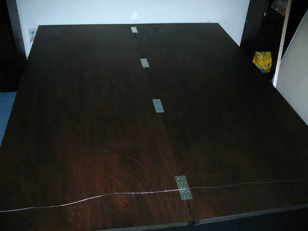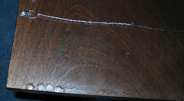 Usé anillo resistente D / alambre ganchos de correa de triángulo para fijar la imagen. Las suspensiones fueron atornilladas en 5" desde la parte superior de los bordes exteriores de las puertas ahora entre corchetes y el alambre fue unido con suficiente elasticidad para ser exactamente 2" desde la parte superior de la puerta. Generalmente los cuadros están conectados 1/3 la longitud de la estructura, pero sentí que esto era demasiado para las puertas. Y 5" funcionado muy bien. Siga este enlace para ver las instrucciones para anudar el alambre de la imagen: http://www.hangingsolutions.com/softstrand.html