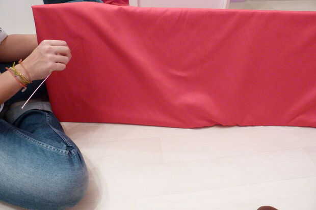 Lugar la parte posterior del cabecero delante de usted y con una gran aguja y un hilo de rosca sólido (sin olvidar hacer un nudo), cruzar a través de la tela y el tablero usando agujeros hecho paso 3.