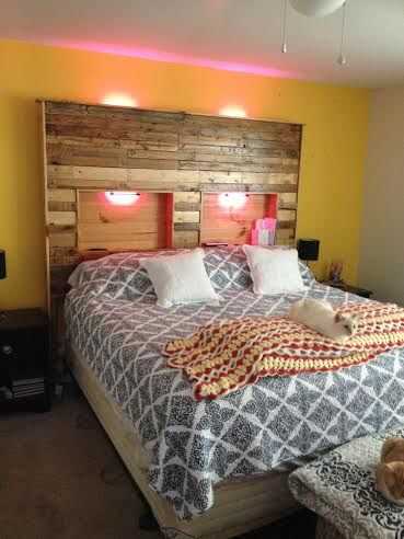 Ahora es el momento para poner los toques finales en su cabecera. He investigado opciones de iluminación y el único que funcionaría para mí era en Lowe. Lowe ' s de tenía Cyron 9" LED luz barras 4 barras de luz y todas las conexiones necesarias para la instalación fácil. Me había montado 1 luz de la barra en cada una de las cajas de empotradas y emparejó ésos debajo de la tapa en la parte posterior del marco. Las luces, una vez montadas, pueden girarse para conseguir el acento deseado. Sólo tuve que taladrar un agujero en cada una de las cajas de empotradas para pasar los cables a la parte posterior del marco. Usé los lazos desde el embalaje para enderezar los cables sueltos en la parte posterior del marco. Podía perforar agujeros en la parte posterior el armazón como el cableado de una casa si usted quiere demasiado. Ahora que tienes tus luces completó su tiempo para moverse dentro de la cabecera. He despojado la cama hasta el marco de la cama y cortar 2 x 4 otro que tenía un lugar para montar el marco de la cama del clavo a través de las piernas. Alinee el marco de la cama para que su centrado en el cabecero y el taladro de los agujeros en su 2 x 4. Utilicé tornillos hexagonales de 4-5/16 x 2-1/2", 16-1/4" arandelas y 4-5/16 tuercas de maleficio. Sujete el marco de la cama a la cabecera y volver a su cama. Este cabecero resultada mejor de lo esperado pero es muy pesado por el uso de 2 x 4 para el marco. Puede que desee utilizar más madera dimensional para el marco por lo que no es tan pesado.