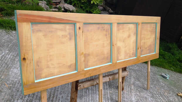 Cosas necesitan; Viejo no deseada puerta de madera, separador de la pintura/barniz, las piernas de un viejo cabecero y algunos tornillos. Opcional, huevo de pato pintura y aceite danés.