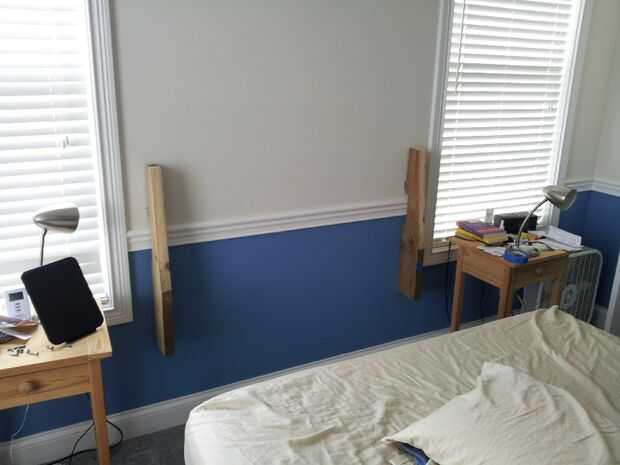 Con los soportes de pared top 2 montados, puso un trozo de cinta en una de 2 X 6 donde quería que la parte superior del colchón, empujó el colchón hacia la pared (es de la pared en la foto), había alineado mi marca de cinta, luego marcó en el 2 X 6 donde su soporte tendría que montarse. La marca se transfiere a los otros 2 X 6 y luego a los soportes de 2 X 6.
