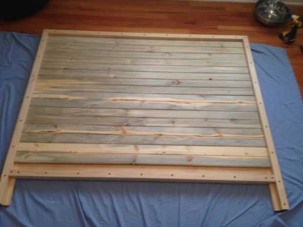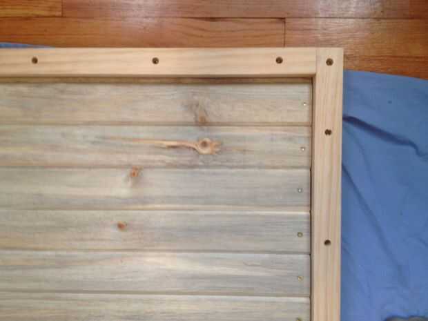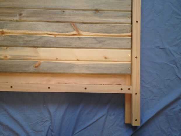 Si cuidado con el pegamento de SAI, el pino selecto requiere lijado de acabado poco. Antes de colocar el cabecero en el marco de la terminé todas las piezas con 3 capas de brazo-R-Seal.