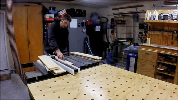 Ahora es el momento para comenzar a ripear los listones. El patrón de chevron hice necesitará cinco pulgadas y listones de 3 pulgadas. Corte un lado limpiado el listón voltearla y rip a su anchura final que ambos bordes limpios y paralelo. Con todos los listones ancho que me hice cargo de la Mitra de sierra para cortar a la longitud. Traté de cortar todo a 24 pulgadas ya que esto iba a ser la parte más larga que se utiliza para hacer el galón. Porque algunos de los extremos se rasgó un poco para arriba y otros tenían otras sucio secciones tuve que cortar más corto. Esto no es un problema ya que algunas de las piezas acabarán consiguiendo cortar más tarde.