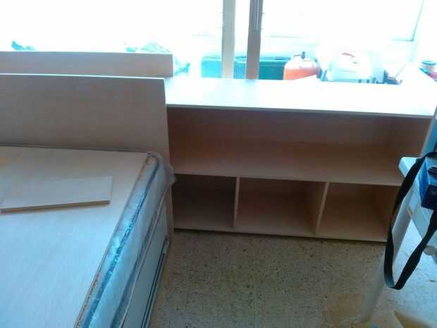 ya que es fácil conseguir de paletas, quiero convertirlos en muebles. Tenía la idea de combinar una mesa con una librería propia y tan había planeado esto.Usé: una plataforma estándar, unas tiras de persiana veneciana, cuatro pequeñas escuadras metál