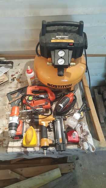 Mis insumos para este proyecto son la culminación de regalos de Navidad, regalos de cumpleaños y pistas improvisadas de Lowe's, todos los cuales he aparece en la foto de arriba. Yo el equipo que hizo este proyecto más fácil para mí, pero mucho de lo puede ser sustituida en muchos casos (por ejemplo, si no tienes un compresor de aire y pistola un simple martillo de uñas y uñas de enfoque está bien).