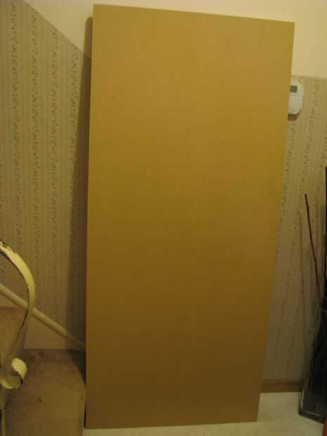 Cortar la hoja de 4 x 8 pies de MDF. Tuvimos nuestra corte en casa depósito porque no cabe en nuestro coche. Usted puede cortar usted mismo con la Sierra de mesa por supuesto. La dimensión es 2,3 pies x 5 pies para un cama doble tamaño.