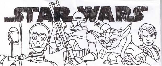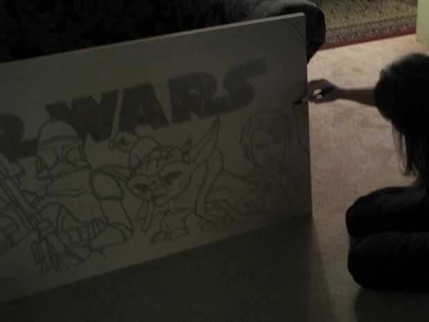 He creado la imagen que se proyectará con una simple libro para colorear de Star Wars. Trazado las imágenes que quería en un orden de como imaginaba a aparecer cuando haya terminado. Si desea utilizar su propio diseño, puede utilizar una mesa de luz para seguimiento o puede utilizar su ventana durante horas de luz para trazar imágenes en plano blanco papel. Si desea utilizar mi imagen subo una copia que usted puede imprimir.