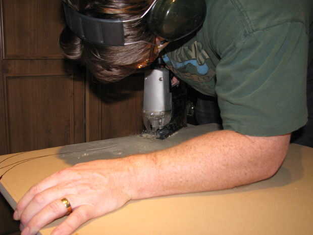 Su hoja de MDF de la abrazadera en su mesa de trabajo. Con sus rompecabezas, cortar las líneas usted "ha creado.