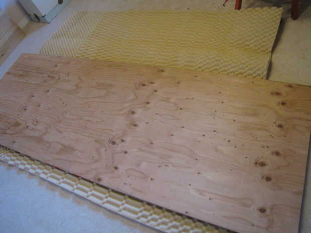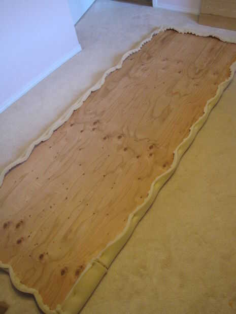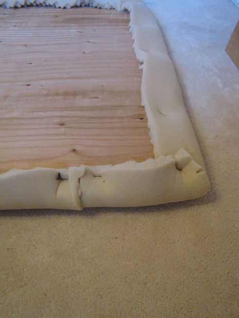 Coloque la madera en su espuma. Puede que necesite recortar exceso apagado en un lugar y utilizar esa pieza en otro lugar. Se puede ver en la segunda imagen (en la parte inferior, lado derecho) Dónde está mi costura. No preocuparse pegado o grapado en la parte delantera. Lo superposición de dejaría una ondulación visible a través de la tela, así que simplemente tope la pieza nueva para arriba al lado de otro. Esto funcionó bien en el final y nunca se sabe que tenía que cortar y pegar mi espuma!