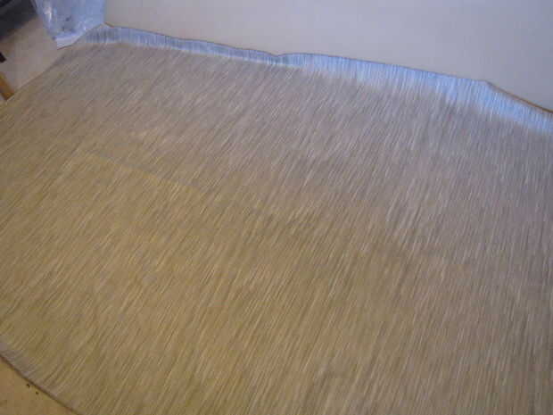 Coloque la tela en el piso, haciendo su mejor para suavizar cualquier ondulaciones o arrugas. ** IMPORTANTE ** Asegúrese de que si la tela tiene un lado bien o mal, que la derecha se enfrenta a la alfombra.