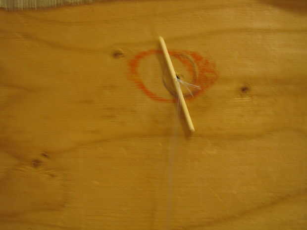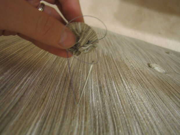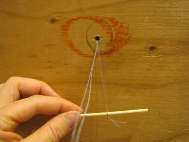 Debe tener el extremo anudado de los hilos colgando. Meter un 2-3" pedazo de pincho de bambú a través de sus dos hebras de hilo y hale la aguja hacia usted hasta que el nudo se mantiene rápido contra el pincho, deteniendo así el hilo de tirar a través al otro lado y saltan a través de la tela o dejándolo caídos.