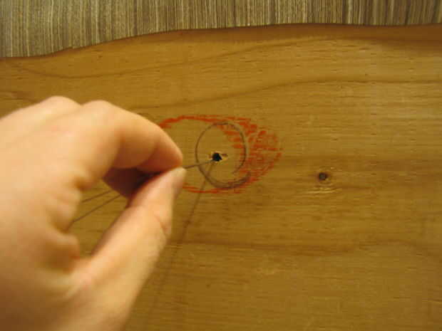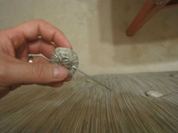 Primer paso: tirar de un pedazo largo del hilo resistente a través de su aguja y nudo para que el hilo se dobla.