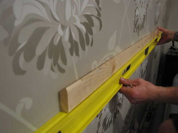 Poner la mitad de la pared y la otra mitad irá en la parte posterior de su cabecera. Localice sus espárragos e insertar un tornillo. Nivel antes de poner los tornillos próximos. Medir y decidir donde quiere su cabecera a sentarse en su pared. Es cómo se decide dónde montar el pistón la mitad de la de 1 x 4 en el cabecero. No te olvides de nivel también.