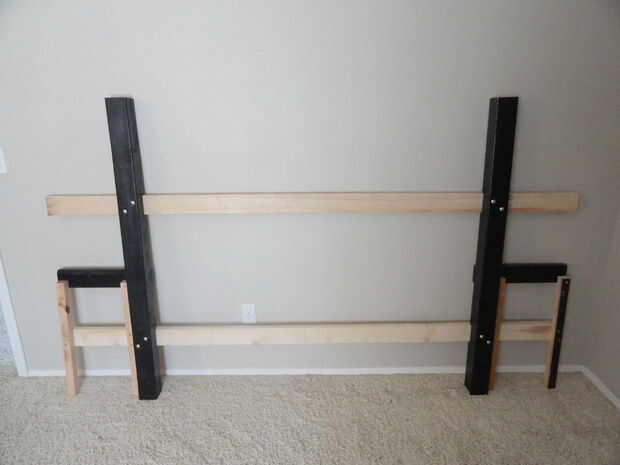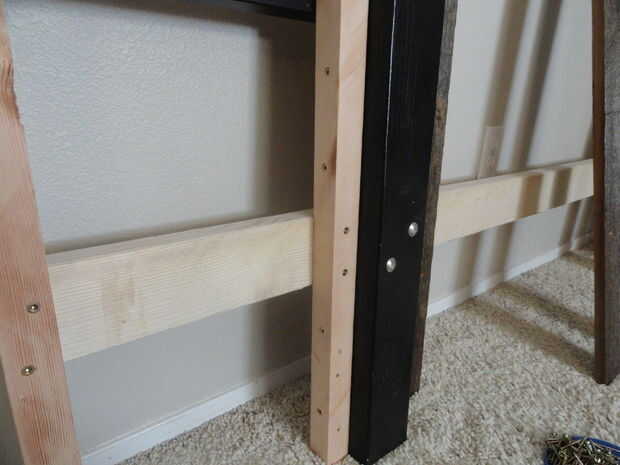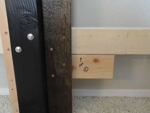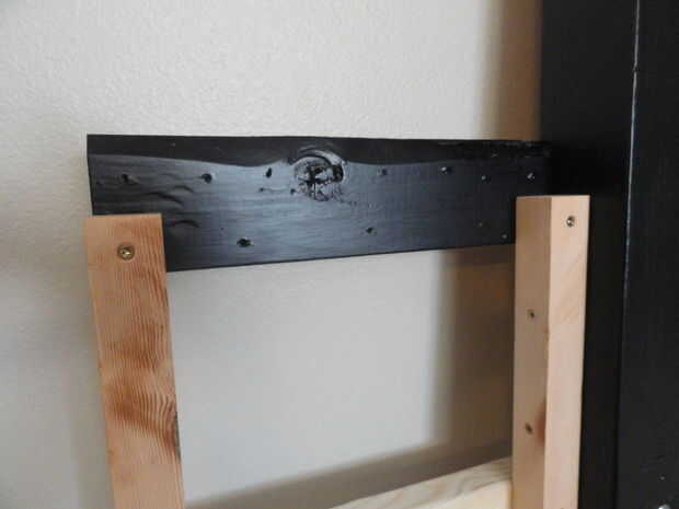 En la 4ª imagen, se puede ver lo que sucede cuando usted olvida los soportes para el marco de la cama al estilo de hollywood están entre seis y 10" del suelo. Alguna manera tiene el borde inferior de la baranda inferior situado 10" del suelo que es demasiado alto! Si recuerdas a localizar el riel inferior a la altura correcta, no tienes que añadir este bloque poco goofy como yo lo hice.