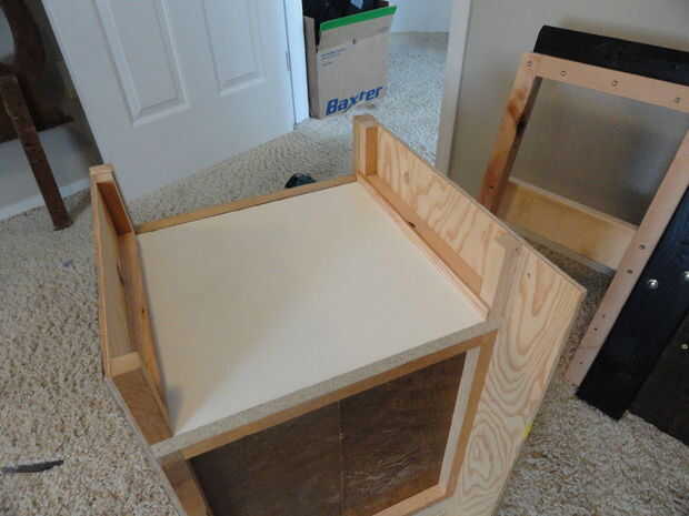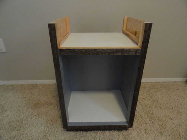 Una vez que se realizó la mayor parte de la cabecera, es una cuestión de averiguar qué tamaño para construir las mesitas de noche. Yo ya había determinado que la superficie de * mi * colchón era de 24 pulgadas del piso y no quiero las mesitas de noche mucho más altos que eso, así que solo decidí hacer los armarios de 24" de altura, así. Empecé con un 2 x 4 en borde base que es 13-1/2" de ancho y 11-1/2" de delante hacia atrás. Para crear un zócalo debajo de la parte delantera del gabinete, he instalado algunos chatarra de melamina blanca de 3/4 que tenía--corte a 13-1/2 "x 13-1/2"--dejándola saliente el bastidor base 2" en la parte delantera. Luego corté dos piezas de madera contrachapada de 1/4 para los lados. Uno es el mismo frente de la medida (13-1/2") a la parte posterior; el otro es más profundo/ancho en parte posterior y cubrir los extremos del riel inferior y que ha añadido en tercer carril. Entonces corté otro trozo de la melamina (mismo tamaño) para la parte superior "estante" y era el momento para construir apoyo para él.