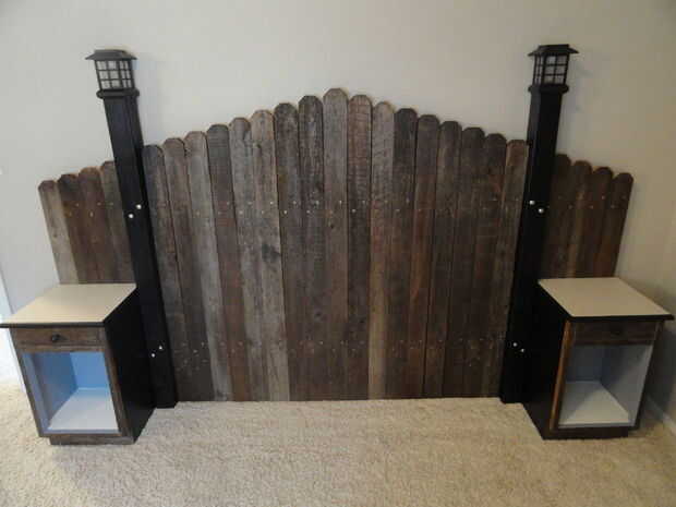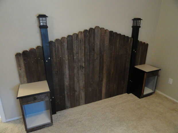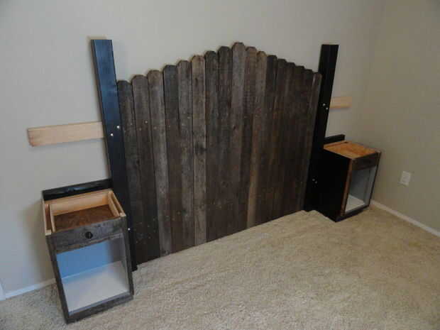 La idea era para que esto sea algo autosuficiente, independiente, que no tiene que fijarse al marco de la cama al estilo de hollywood. La pared mantiene inclinada hacia atrás. Y las mesitas de noche de inclinarse hacia adelante. Como una cuestión práctica, ¡ seguí revisando como yo estaba la construcción de las mesitas de noche para asegurarse de que encajaría como yo quería que. Como sólo se llevan a cabo las diferentes piezas con tornillos, esto es bastante simple de hacer.