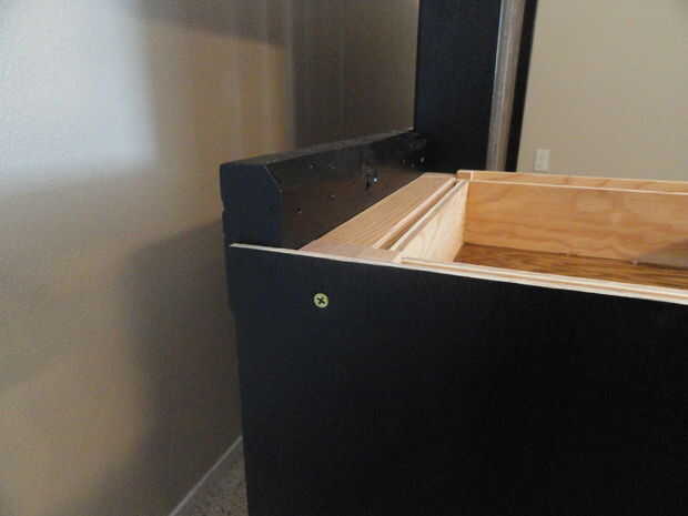 Para hacer las tapas del gabinete, medí deja aproximadamente un 1" solapamiento en los lados y del frente y cortar dos 3/4" piezas de madera de desecho a esa dimensión. Luego arrancó unas tiras de pino que eran 1/4" espesor de 3/4". Con Titebond II 18 y pegamento de madera calibre clavitos (neumático clavadora) os adjunto a los bordes de la madera contrachapada después cuidadosamente inglete las esquinas delanteras para adaptarse. Es importante los bordes superiores de estas tiras al ras con la superficie de la madera contrachapada. Si los bordes inferiores se extienden hacia abajo por debajo de la cara inferior de la madera contrachapada, que está bien, no importa. Luego corté dos trozos de Formica, asegurándose de que cubran la madera por los cuatro costados. (El Formica puede sobresalir sobre el pegado en madera cantos macizos... no duele nada.) El borde posterior (al lado de la pared) debe ser al ras generalmente que el borde de la cinta hacia abajo y utiliza la cinta como una bisagra a la espalda de Formica y (con un cepillo de viruta disponible) cubre la parte inferior y la superficie de la madera contrachapada con cemento de contacto Original receta. (Usted puede utilizar el material de base de látex, bajo olor pero una capa tendrá que secar y luego una 2 º capa aplicada a menos que utilice un pequeño rodillo disponible para aplicar el adhesivo). Después de que el cemento de contacto esté completamente secado, utilice un rodillo o una mano firme para asegurarse de que la Formica es firmemente adherido a la parte superior de madera contrachapada.